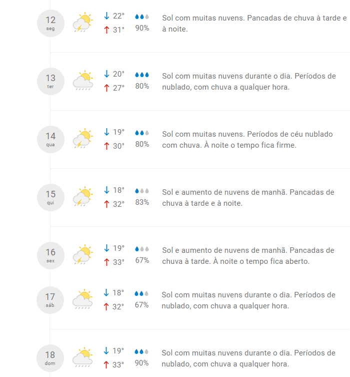 A possibilidade de chuva pode variar entre 67 e 90% dependendo do dia