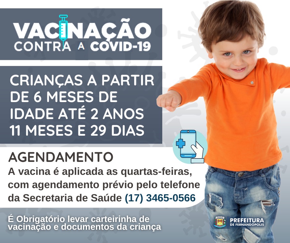 A Secretaria Municipal de Saúde comunica que está liberada em Fernandópolis a vacinação em bebês e crianças com idades entre 06 meses e menos de 03 anos contra a Covid-19. Para esse público, seguindo determinação do Ministério da Saúde, as doses aplicadas são Pfizer.