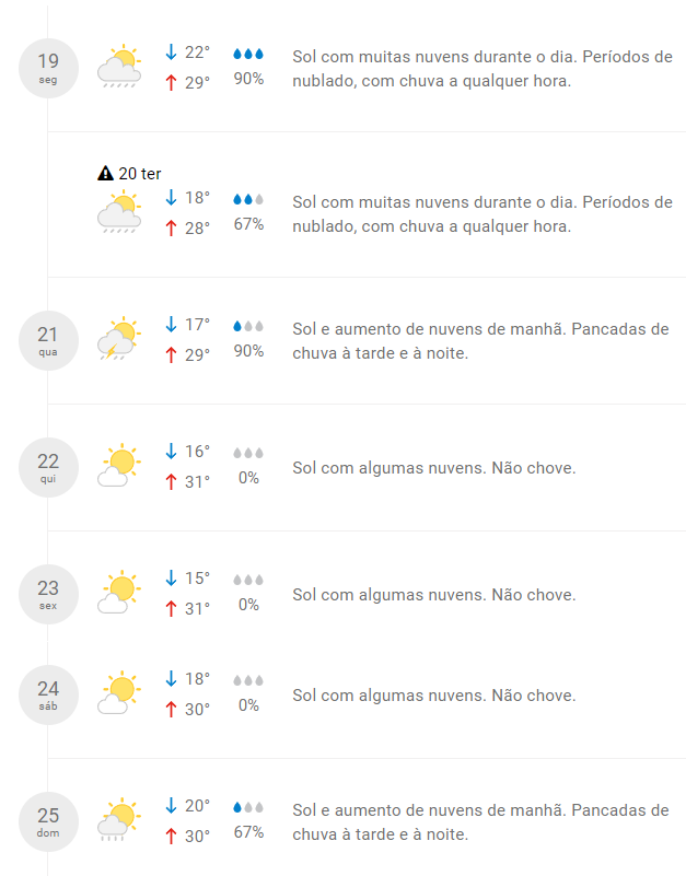 Apenas no domingo a possibilidade de chuva retorna com o aumento de nuvens pela manhã e 67% de chance de ocorrerem pancadas de chuva durante e tarde a noite.