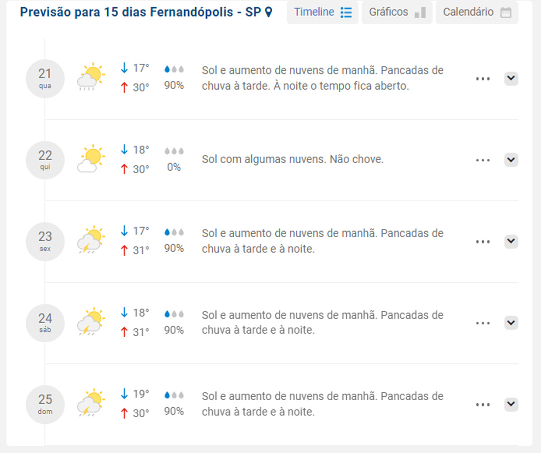 Há possibilidade grande de ocorrência de chuvas em Fernandópolis e na região durante os festejos natalinos.