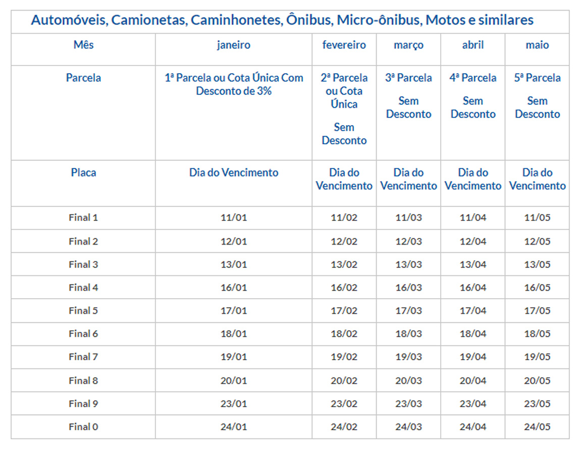 Os caminhões têm prazos diferenciados: para o pagamento integral em janeiro é concedido desconto de 3%; para os proprietários que optarem pelo parcelamento em três, quatro ou cinco vezes, sem desconto, os vencimentos são em 20 de março, 20 de abril, 20 de maio, 20 de julho, 20 de agosto e 20 de setembro (veja as tabelas completas abaixo).