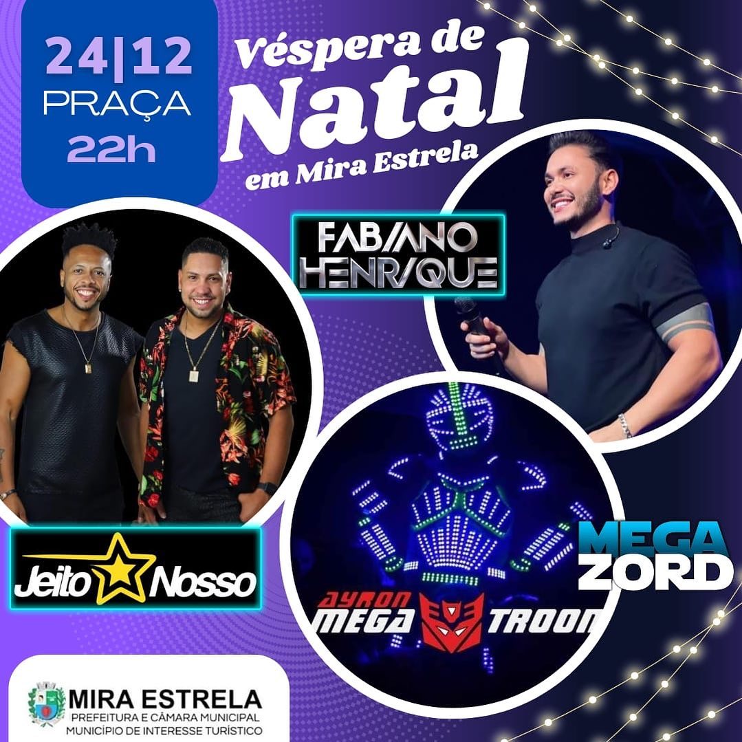 No próximo sábado, dia 24, na Praça Central de Mira Estrela, a Prefeitura, com o apoio da Câmara Municipal, realizará o Véspera de Natal.