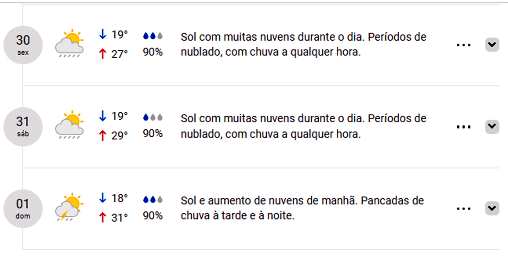 Tanto para a próxima sexta-feira, 30, sábado, 31, e domingo 01, a possibilidade de pancadas chegam a 90%, afirma o Clima Tempo.
