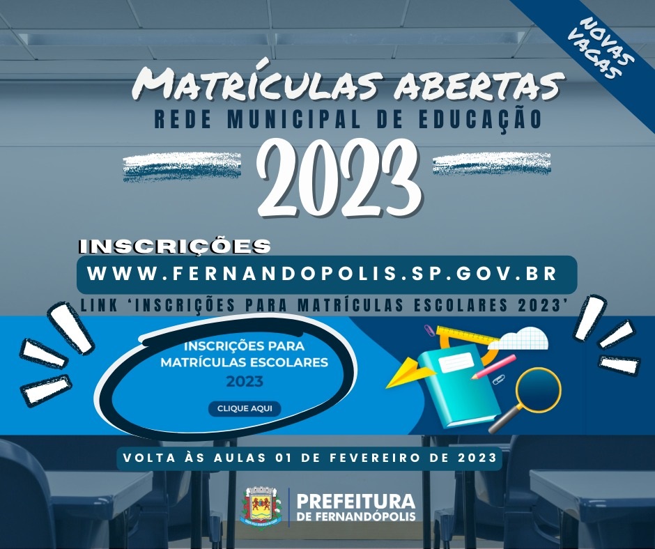 Para garantir uma vaga basta entrar no site www.fernandopolis.sp.gov.br, clicar no link ‘Inscrições para matrículas escolares 2023’ e preencher o Formulário de Inscrição para Matrículas Iniciais ou transferência de Unidade Escolar, com dados pessoais do aluno e seu responsável.