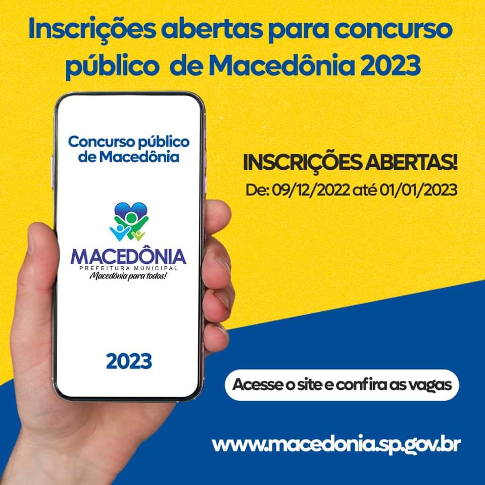 As inscrições do concurso público para a Prefeitura de Macedônia, abertas desde o último dia 9 de dezembro, estão na reta final. O prazo irá se encerrar dia 1º de janeiro de 2023.