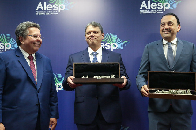 Pignatari, Tarcísio e Ramuth na Alesp durante a posse. Foto: Divulgação / Rodrigo Romeo