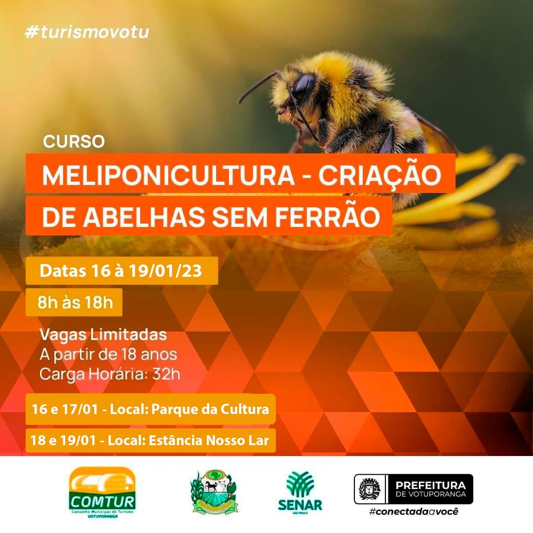 A Secretaria da Cultura e Turismo de Votuporanga, em parceria com o Serviço Nacional de Aprendizagem Rural (Senar), Sindicato Rural de Votuporanga e o Conselho Municipal de Turismo (Comtur), realizará o curso "Meliponicultura – Criação de Abelhas sem Ferrão" de 16 a 19 de janeiro de 2023, das 8h às 18h, com aulas teóricas e práticas. Interessados a partir de 18 anos podem efetuar inscrição através do link https://forms.gle/GHs66cBsxru8R9Yf7 ; as vagas, limitadas, se efetivam por ordem de recebimento do cadastro.