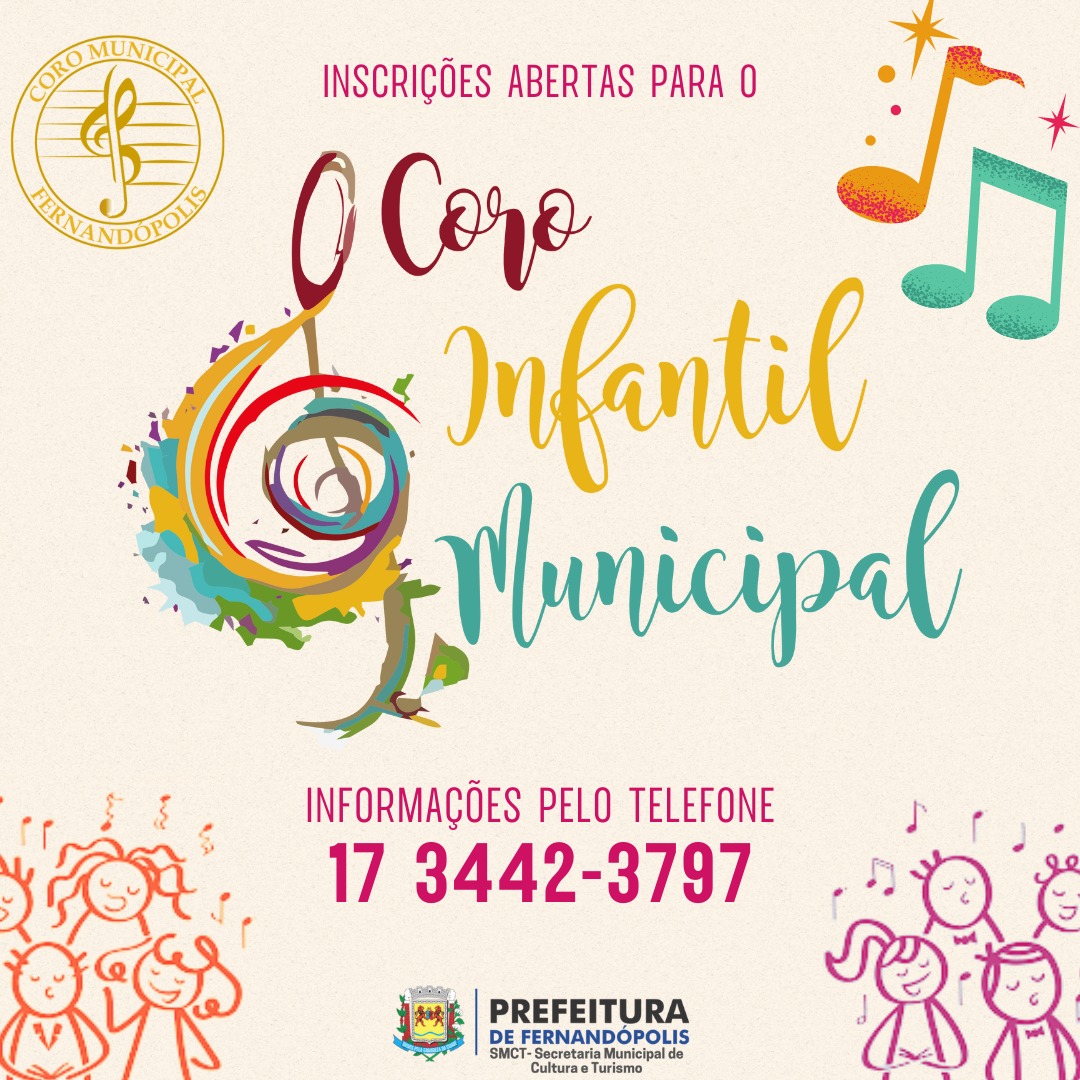 O Coro Infantil foi implantado em Fernandópolis no ano de 2017, uma iniciativa da Prefeitura por meio da Secretaria Municipal de Cultura e Turismo. Mais informações e reserva de vaga pelo telefone 3442-3797.