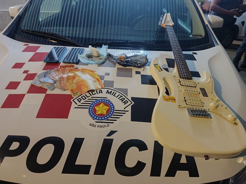 Além da droga, os policiais apreenderam também uma guitarra, uma caixa de som e dois aparelhos celulares.