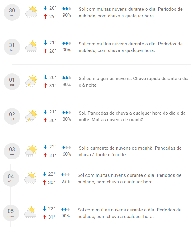 O clima prevalecente será de sol com muitas nuvens e pancadas de chuva a qualquer hora. As temperaturas podem variar entre 20ºC e 31 ºC.