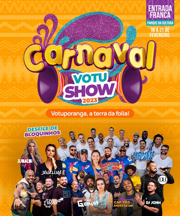 O prefeito Jorge Seba, em coletiva de imprensa realizada nesta sexta-feira (3/2) e com transmissão pelas redes sociais da Prefeitura e da imprensa de Votuporanga, anunciou oficialmente que o município terá novamente o tradicional carnaval popular, com o apoio dos Conselhos Municipais de Turismo e de Políticas Culturais, da Câmara Municipal, Unifev e Rádio e TV Unifev. A festa "Carnaval Votu Show 2023" ocorrerá gratuitamente no palco externo do Parque da Cultura nos dias 18, 19, 20 e 21 de fevereiro com nomes da música nacional e artistas locais.