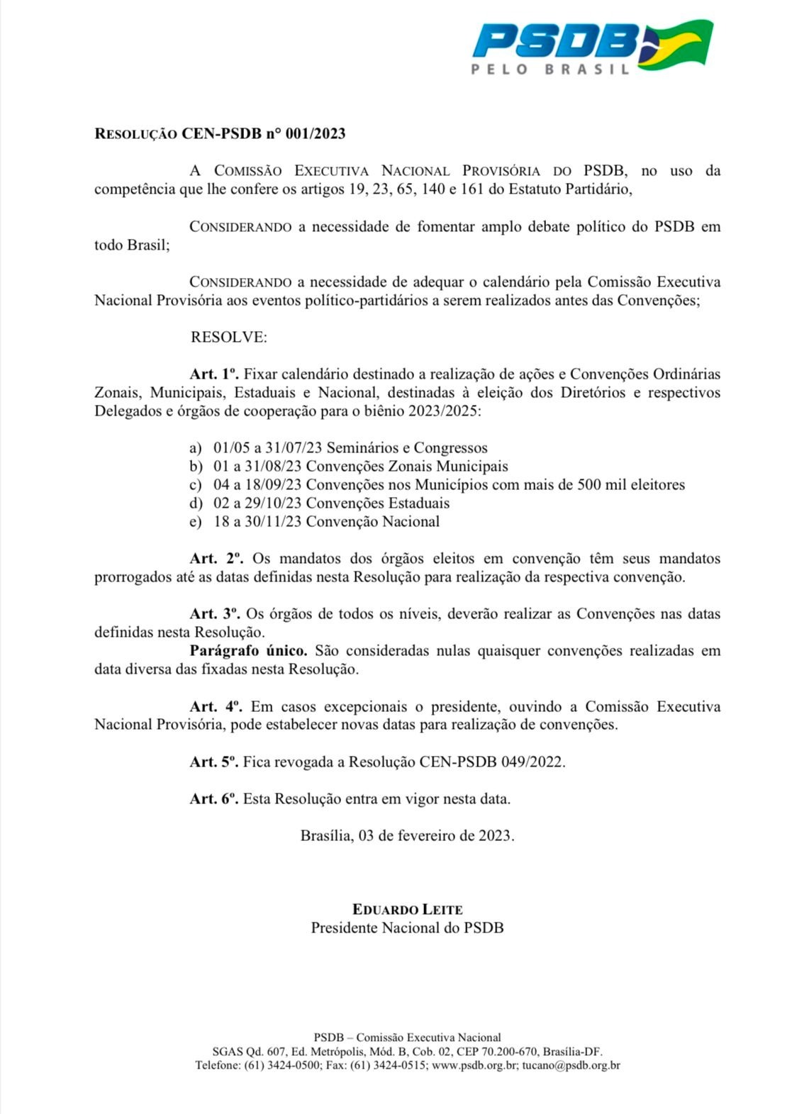 Reunida nesta sexta-feira, 03, a Executiva Nacional do PSDB aprovou, por unanimidade, o adiamento dos prazos de realização das convenções municipais, estaduais e nacional. Assim, fica revogado o calendário de convenções previsto na resolução CEN 049/2022.