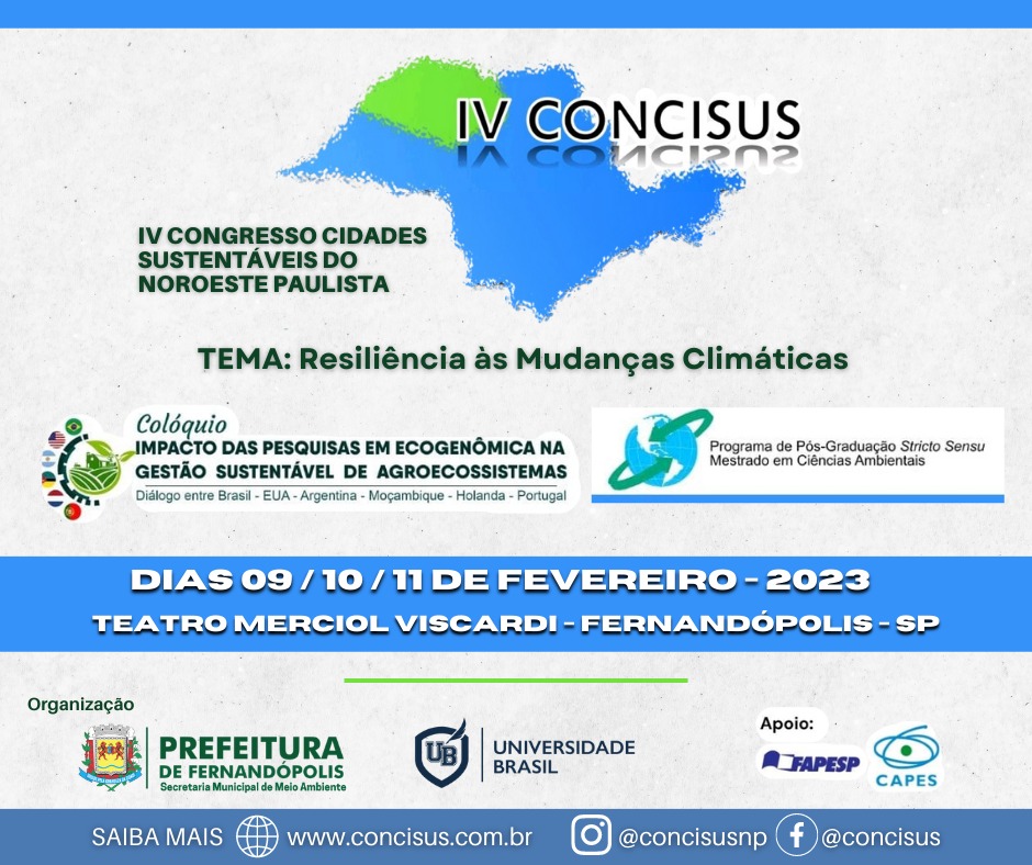 O IV Congresso Cidades Sustentáveis do Noroeste Paulista/CONCISUS, com a temática “Resiliência às Mudanças Climáticas”, começa nesta quinta-feira, 09, em Fernandópolis e vai até o próximo dia 11 no Teatro Municipal.