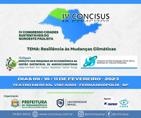 A realização do congresso é uma ação conjunta da Prefeitura de Fernandópolis, por meio da Secretaria Municipal de Meio Ambiente e Universidade Brasil, com apoio da FAPESP e CAPES.