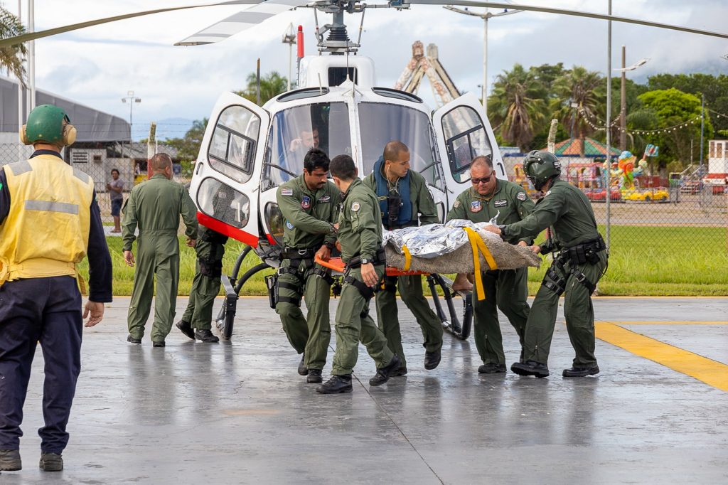 O Comando de Aviação da Polícia Militar e o Exército Brasileiro ampliaram o número de aeronaves destacadas aos trabalhos de resgate, salvamento e identificação das vítimas das fortes chuvas que atingiram o Litoral Norte ao longo do fim de semana. Atualmente, 14 helicópteros estão à disposição para o transporte das tropas aos locais de difícil acesso, bem como a remoção de vítimas e corpos.
