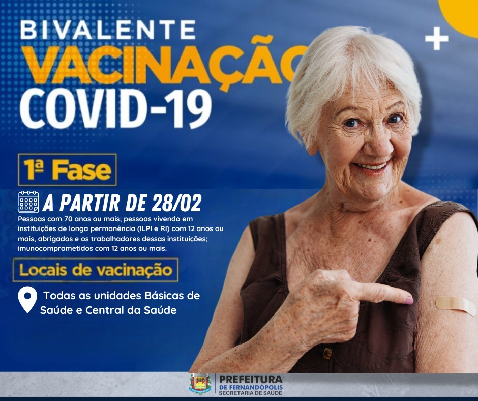 A Secretaria Municipal da Saúde comunica que terá início nesta terça-feira, dia 28, em Fernandópolis mais uma etapa da campanha de vacinação contra a Covid-19. Nesta nova fase a população será vacinada com o reforço do imunizante bivalente da Pfizer.
