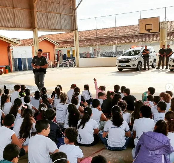 Na última segunda-feira, 27, policiais militares do 3º Grupamento de Polícia da 1ª Companhia, do 16° Batalhão de Polícia Militar do Interior, realizaram uma ação de aproximação com as crianças da Escola Municipal de Educação Infantil Professora Paula Zangrando, na cidade de Meridiano.