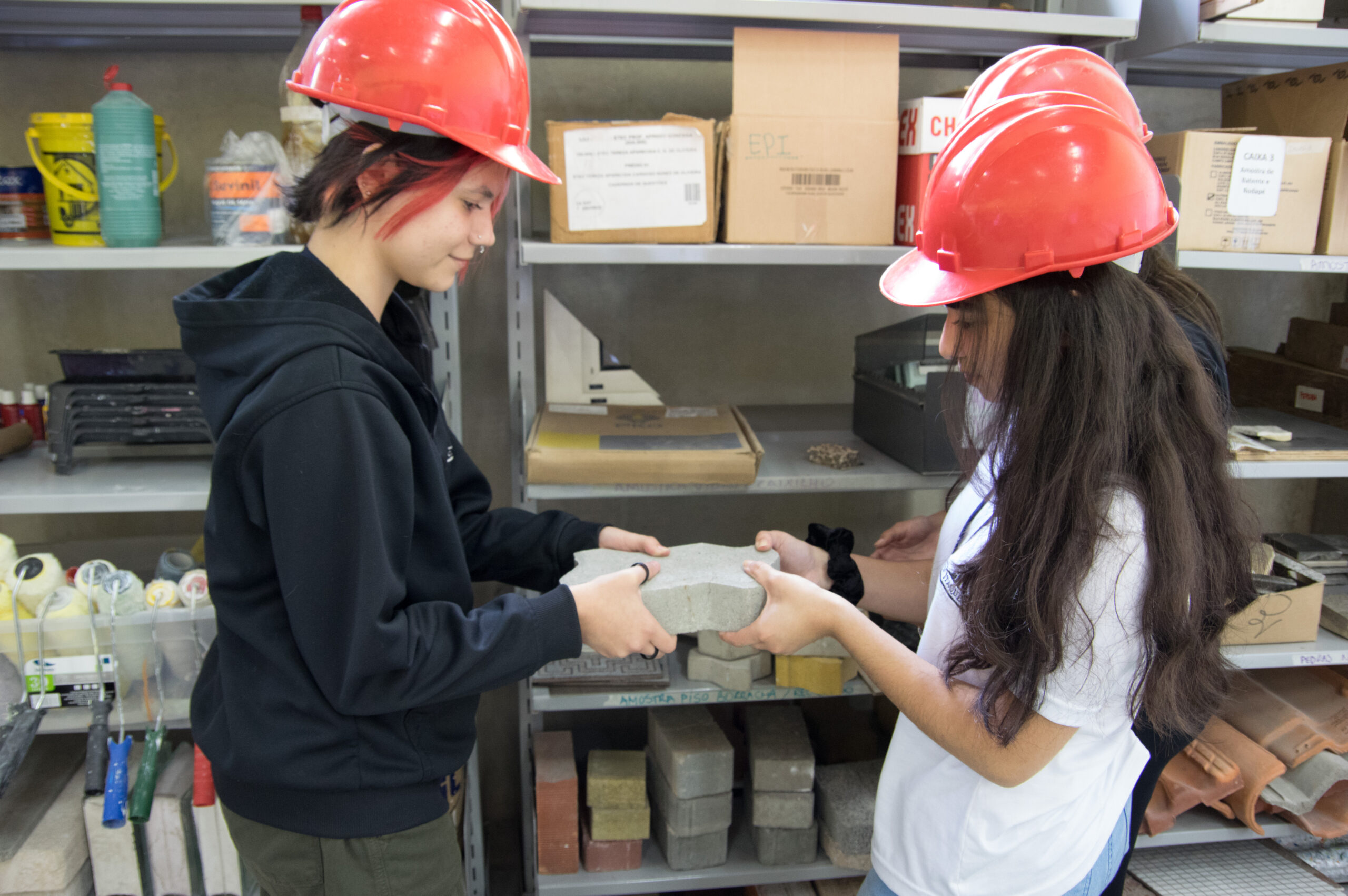 Alunas do curso de Edificações, da Etec Itaquera II, analisam materiais de construção durante atividade em aula prática - Foto: Roberto Sungi