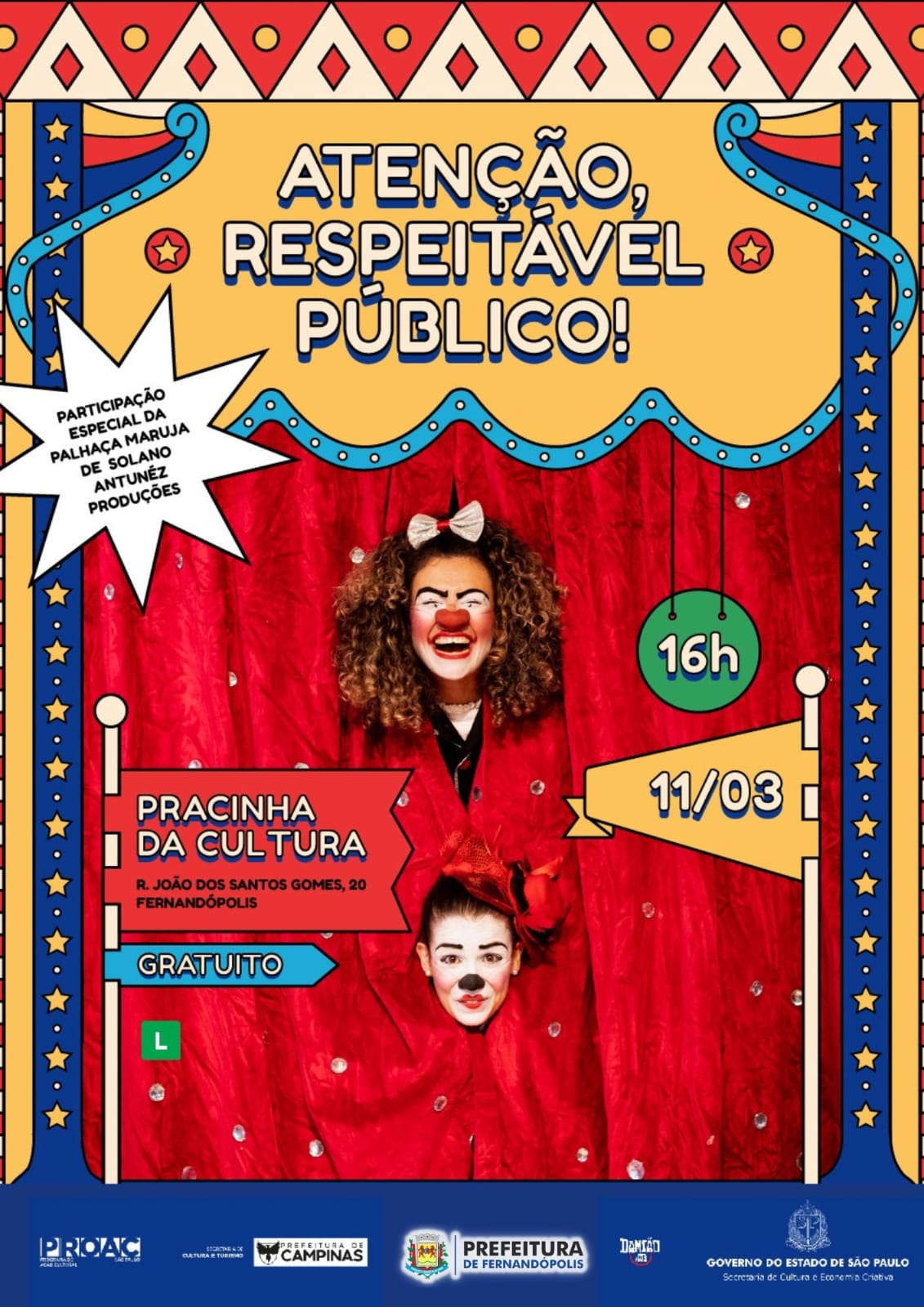 A atração terá início às 16h na Pracinha da Cultura, oferecida gratuitamente à toda população, realizada por uma parceria da Secretaria de Cultura e Turismo do Estado pelo ProAC e Prefeitura de Fernandópolis, por meio da Secretaria Municipal de Cultura e Turismo.