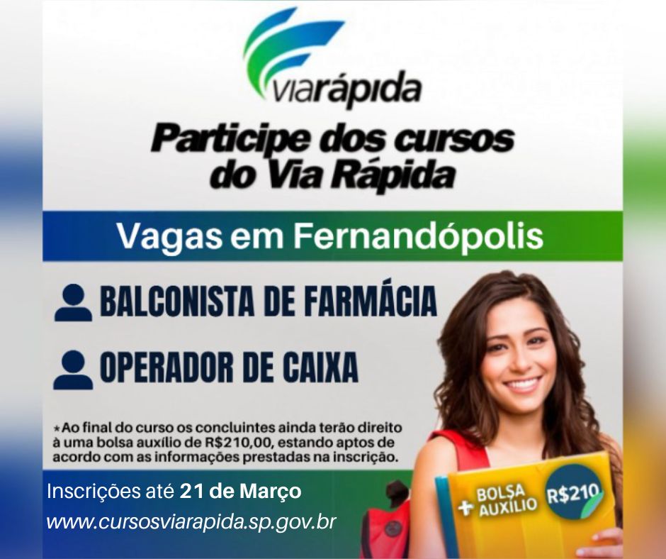 A Prefeitura de Fernandópolis, por meio do Fundo Social de Solidariedade, comunica que estão abertas as inscrições para os cursos da Via Rápida, do Governo do Estado e seguem até o próximo dia 21.