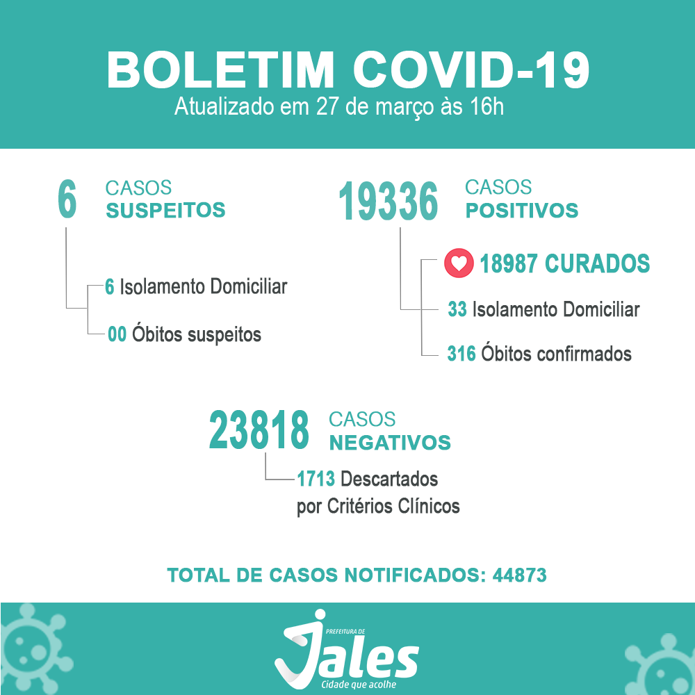 Por deliberação do Comitê de Enfrentamento à covid-19, desde 3 de outubro, os boletins epidemiológicos passaram a ser publicados apenas às segundas-feiras no site da Prefeitura de Jales (https://jales.sp.gov.br/boletim-covid-19/).