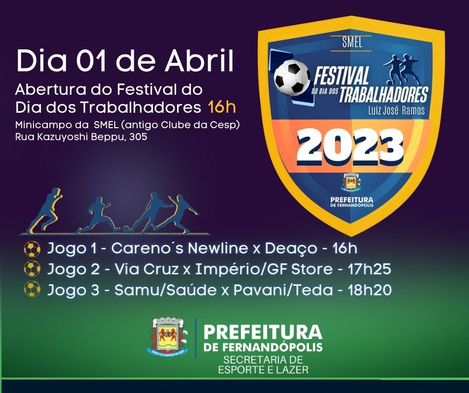 A comissão organizadora do Festival dos Trabalhadores 2023 confirmou a abertura e a primeira rodada da competição para este próximo sábado, 01, no mini campo da SMEL – Secretaria Municipal de Esportes e Lazer.