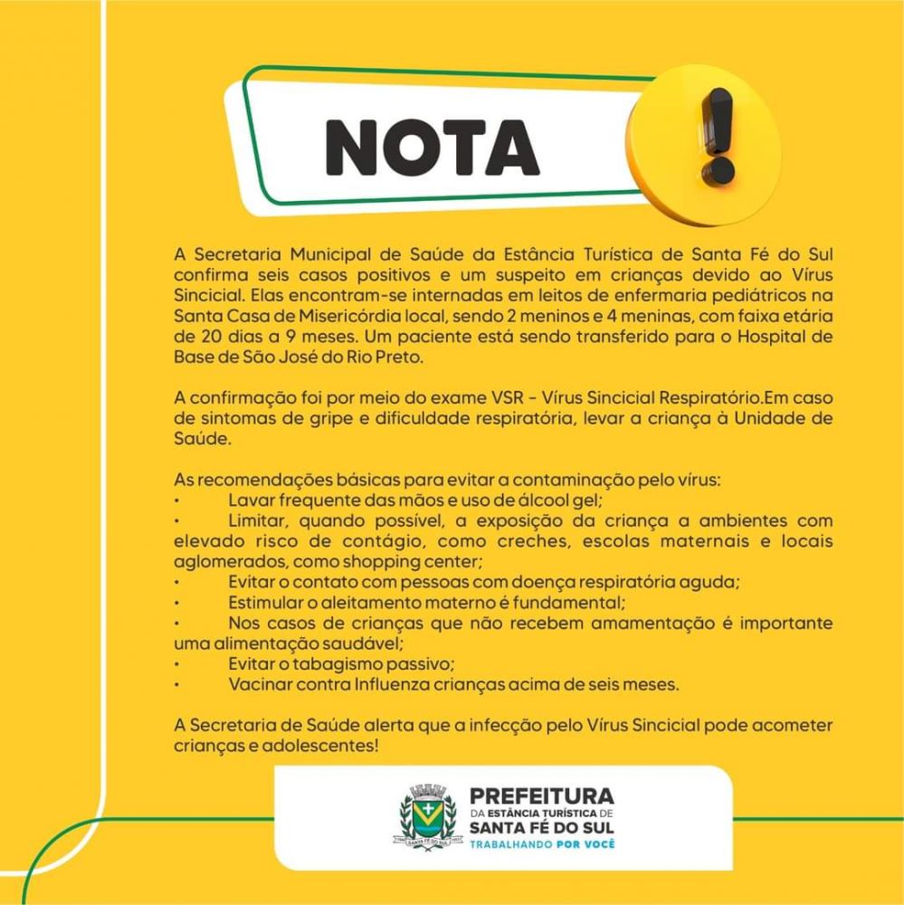 A confirmação veio através de exame VSR - Vírus Sincicial Respiratório. A prefeitura de Santa Fé do Sul orientou que pais e responsáveis levem as crianças até as Unidades de Saúde em caso de sintomas de gripe e dificuldade respiratória.