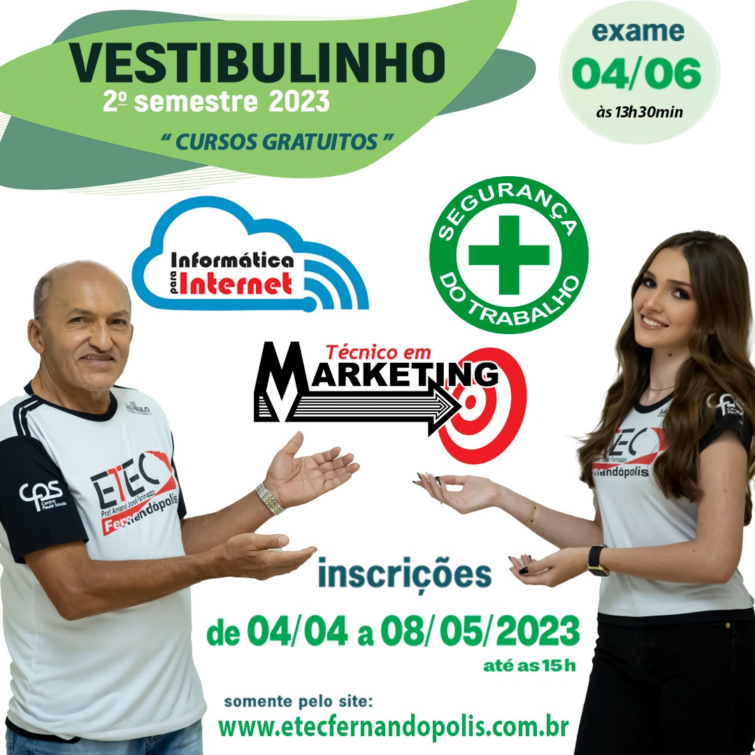 A Escola Técnica Estadual (Etec) de Fernandópolis está oferecendo 40 vagas para cada um dos três cursos técnicos disponíveis. São eles: Técnico em Informática para Internet, Técnico em Marketing e Técnico em Segurança do Trabalho, todos com duração de três semestres. As aulas serão realizadas no período noturno, de segunda-feira a sexta-feira, das 19h00 às 23h00.