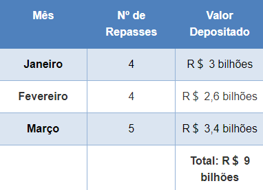 O último repasse referente ao mês de março aconteceu nesta terça-feira, 04, no valor de R$ 497 milhões