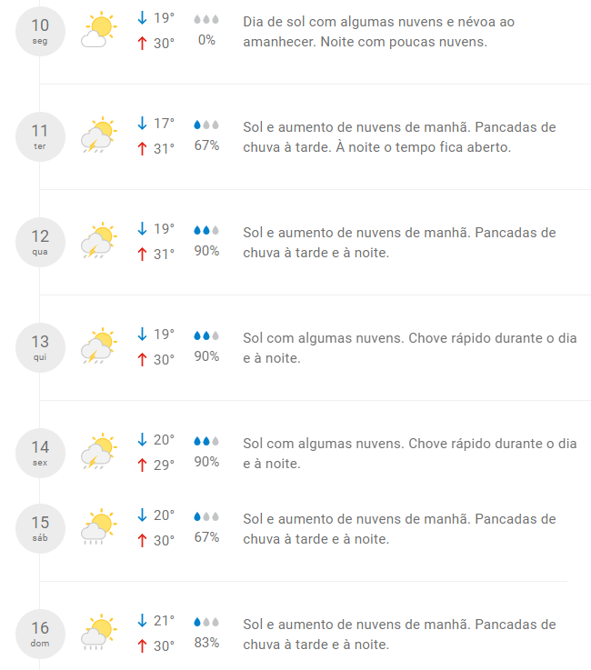 Segundo a previsão do portal, as chances de chuva podem variar entre 67% e 90% dependendo do dia. O clima geral deverá ser de sol com nuvens, com pancadas de chuva mais concentradas durante a tarde e noite.