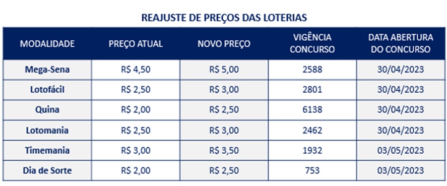 As alterações entrarão em vigor a partir de 30 de abril para Lotofácil, Mega-Sena, Quina e Lotomania. A partir de 3 de maio, o reajuste passa a valer também para a Timemania e Dia de Sorte.