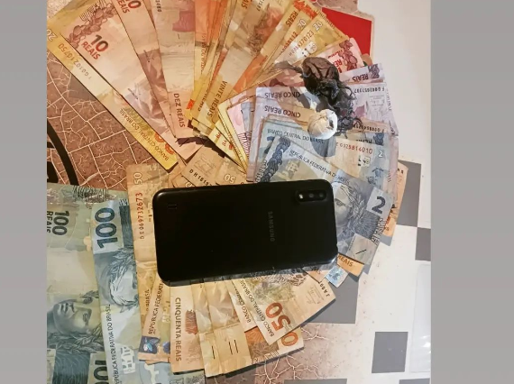 Na abordagem do veículo foi possível visualizar os ocupantes dispensado algo no assoalho, sendo que o objeto dispensado pelo indivíduo foi localizado posterior e aparentava ser cocaína, envolta em plástico transparente, já em busca pessoal nada de ilícito foi localizado. Já a menor dispensou uma porção de cocaína envolta em plástico de cor preta, e realizada busca pessoal por uma policial foi localizada ainda a importância de R$ 1.438.00 reais em notas diversas, que estavam em sua blusa, além de um aparelho celular.