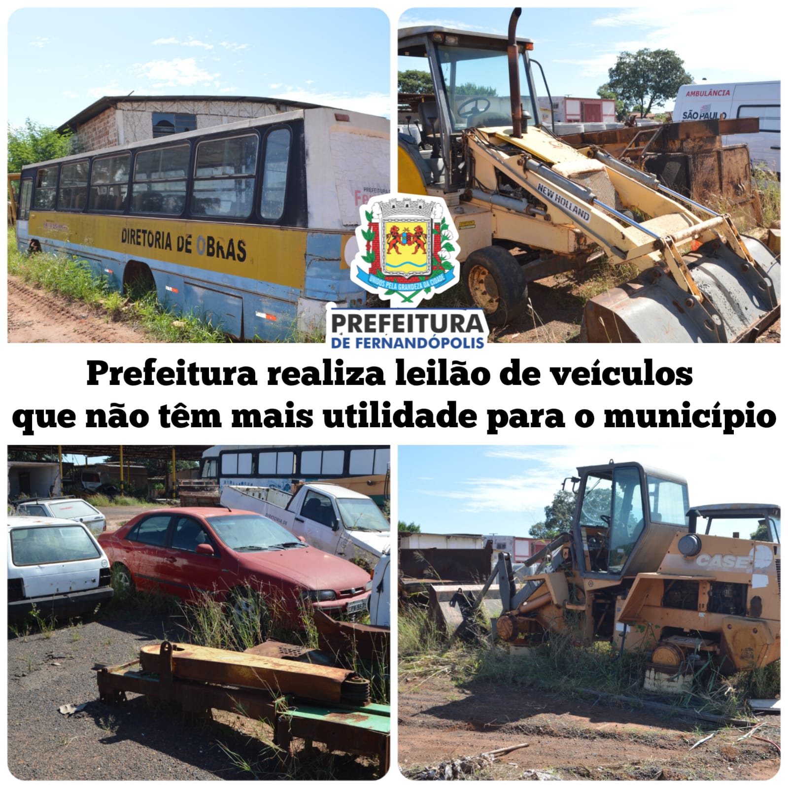 A Prefeitura de Fernandópolis realizará na próxima quarta-feira, 26, um leilão de itens que não tem mais utilidade para o município, entre: carros, caminhões, micro-ônibus, máquinas, equipamentos e outros. São veículos e maquinários sem condição de uso e que hoje são consideradas sucata e alguns que ainda são considerados como circulação.