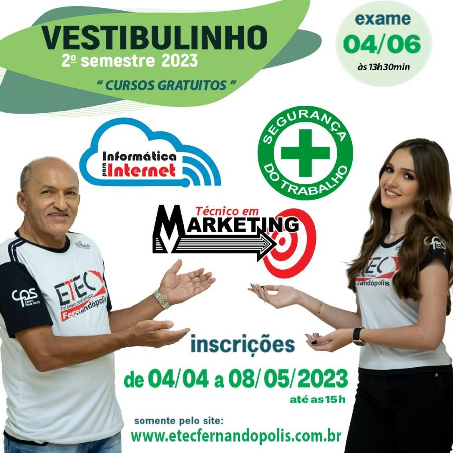 A ETEC - Escola Técnica Estadual “Professor Armando José Farinazzo” de Fernandópolis está com inscrições abertas até às 15h, do dia 08 de maio, do ‘Vestibulinho 2º semestre de 2023’. Estão sendo oferecidas 40 vagas para cada curso de: Técnico em Informática para Internet, Técnico em Marketing e Técnico em Segurança do Trabalho. Todas as opções são para três semestres.