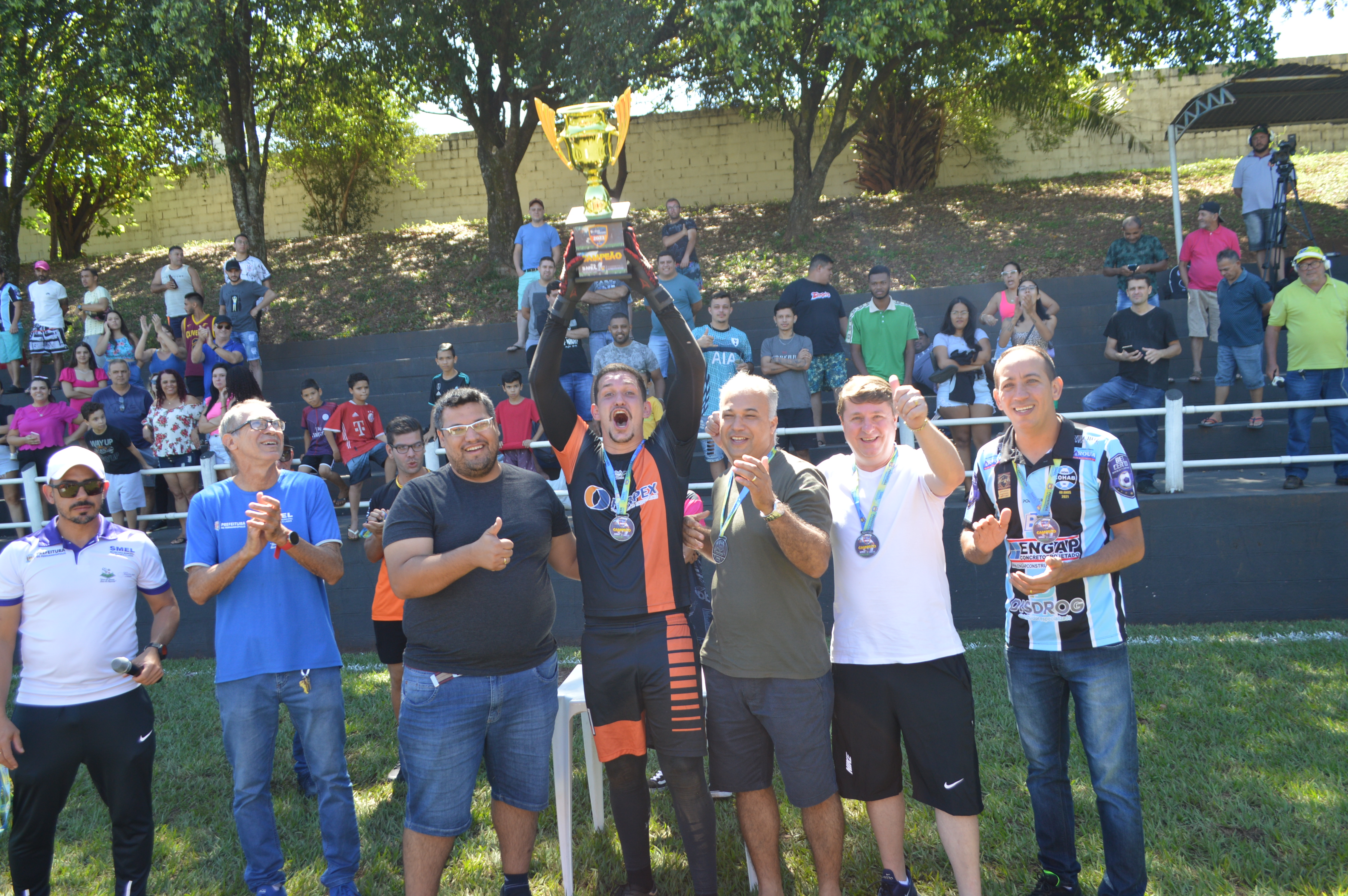Representante da Ferpex recebe o troféu de campeão junto a autoridades municipais. Foto: Secom de Fernandópolis