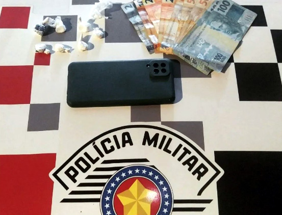 Polícia apreendeu porções de cocaína, dinheiro e celular com o acusado. Foto: Reprodução / PM-SP