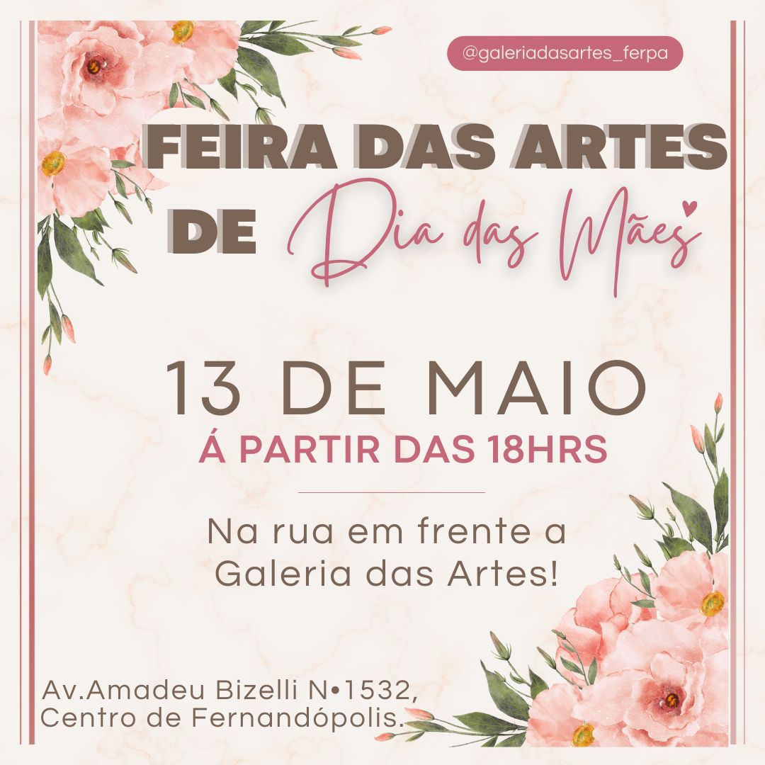 No próximo sábado, dia 13, das 18h às 22h, será realizada a primeira edição do ano da Feira das Artes. O evento, realizado pela loja Galeria das Artes, irá reunir cerca de 30 artesãos, terá praça de alimentação e atração musical.