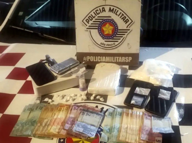 Apreensão de 18 porções, um tijolo, de cocaína, celular, anotações e R$ 3,8 mil. Foto: PM-SP