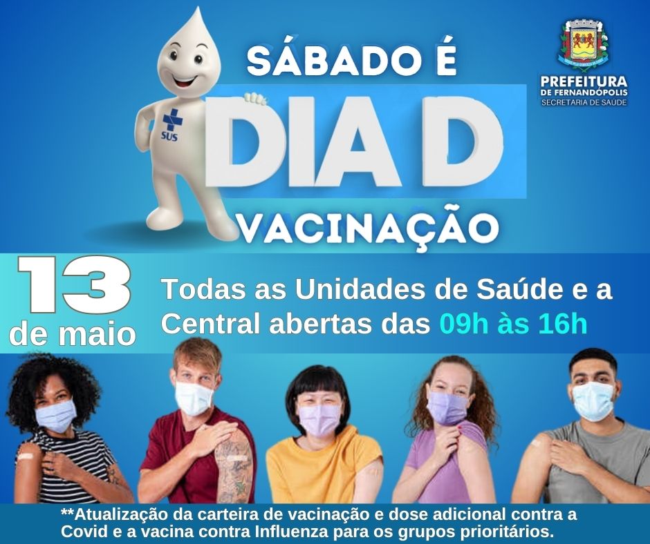 No intuito de diminuir a incidência de doenças graves no município e aumentar a cobertura vacinal, a Prefeitura de Fernandópolis, por meio da Secretaria Municipal de Saúde realizará no próximo sábado, dia 13, o Dia D de Vacinação. Neste dia, as Unidades de Saúde e a Central estarão abertas das 09h às 16h para a vacinação.