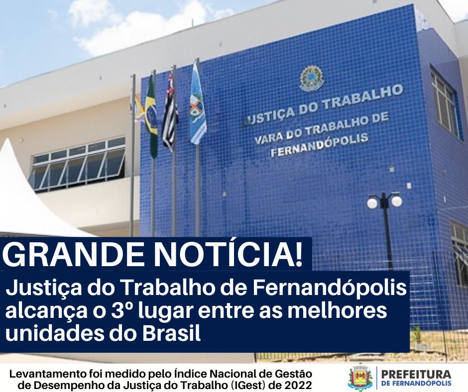 Uma grande notícia chegou ao conhecimento dos funcionários da Justiça do Trabalho de Fernandópolis. Segundo os dados divulgados pelo Índice Nacional de Gestão de Desempenho da Justiça do Trabalho (IGest) de 2022, a unidade de Fernandópolis ficou entre as três melhores do Brasil. A classificação inédita entre as unidades judiciárias do Tribunal Regional do Trabalho da 15ª Região, trouxe destaque especial para Fernandópolis, que pertence a circunscrição de São José do Rio Preto.