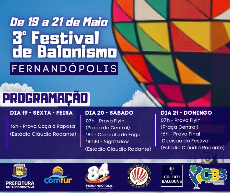 Começa na próxima sexta-feira, 19, a 3ª edição do Festival Fernandópolis de Balonismo. Até o dia 21 de maio, pilotos de todo o Brasil irão disputar provas técnicas da modalidade esportiva encantando adultos e crianças. O evento é uma das principais atrações comemorativas ao aniversário de 84 anos do município.