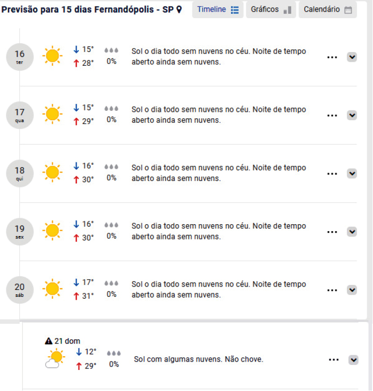 Segundo o site de previsão meteorológica Clima Tempo, durante esse período teremos temperaturas amenas, variando entre 15º e 31º, com tendência a queda a partir do domingo, 21, quando a mínima será de 12º.