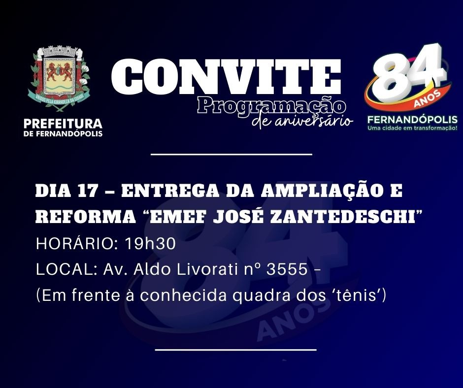 Dentro do calendário comemorativo aos 84 anos de Fernandópolis, a Educação mais uma vez ganha destaque. Nesta quarta-feira, 17, acontece a entrega da reforma e ampliações da EMEF José Zantedeschi.