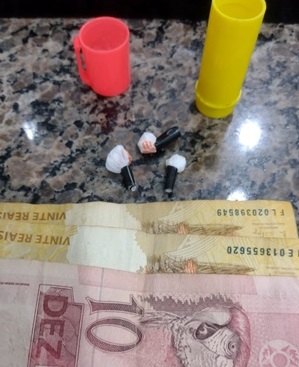 Os policiais relataram que durante durante patrulhamento pelo centro da cidade notaram que duas pessoas realizavam uma transação no corredor da escola, situada na rua Rio de Janeiro. Eles abordaram dois indivíduos, sendo que com um deles encontrou três porções de cocaína já prontas para serem comercializadas.