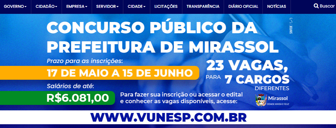 A Prefeitura Municipal de Mirassol-SP publicou a abertura de inscrições para concurso público visando a contratação de 23 profissionais de diversas áreas, com salários que vão de R$ 1,7 mil até R$ 6 mil.