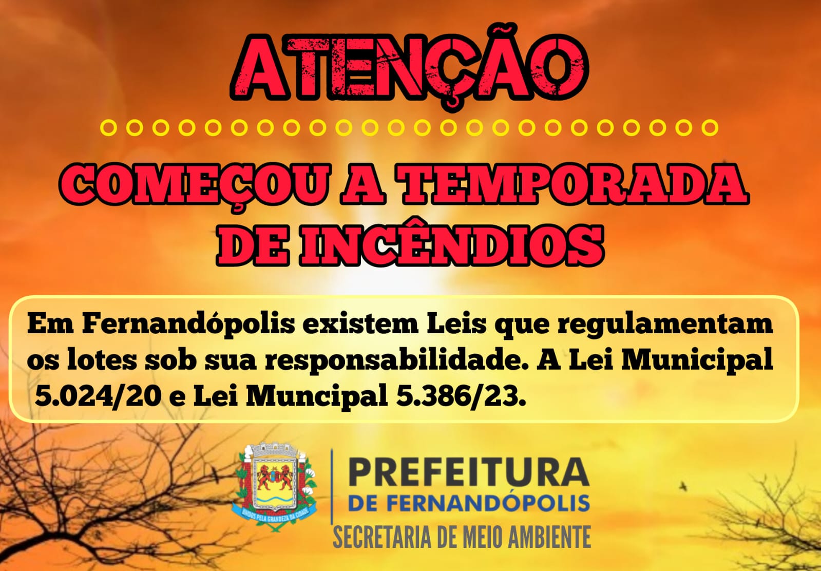 Também em 2023, foi aprovada a Lei Municipal nº 5.386, que trata especificamente de incêndios, podendo gerar multa para o munícipe que queima outros tipos de materiais, desde papel até plástico e borracha. O valor das multas varia de acordo com o tipo e quantidade de material queimado.