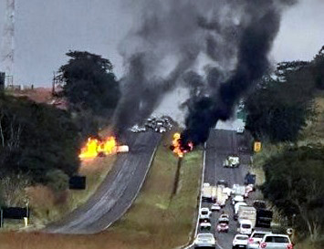 Um caminhão tanque carregado com cerca de 30 mil litros de combustível, por motivo a ser apurado, tombou na via e, após explosões, acabou pegando fogo.