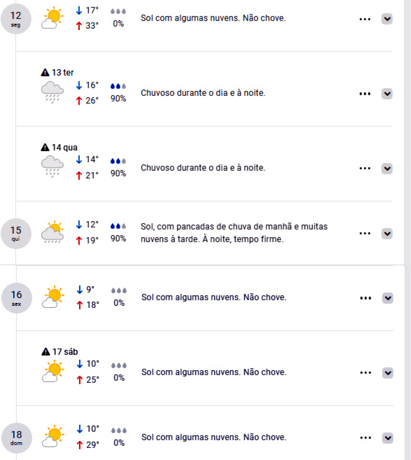 Previsão do tempo e temperatura para a semana. Fonte: Clima Tempo