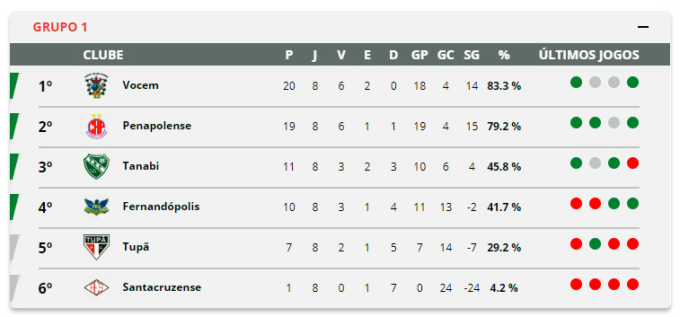 No Grupo 1, onde está o Fernandópolis Futebol Clube (Fefecê), o Vocem de Assis manteve-se na liderança geral atingindo 20 pontos após vencer o Fernandópolis, em casa, por 3 x 0. Os gols da partida foram marcados por Luquinhas aos 40 minutos do primeiro tempo, por Taylor aos 29 minutos do segundo tempo e por Brayan já na prorrogação (48 minutos).