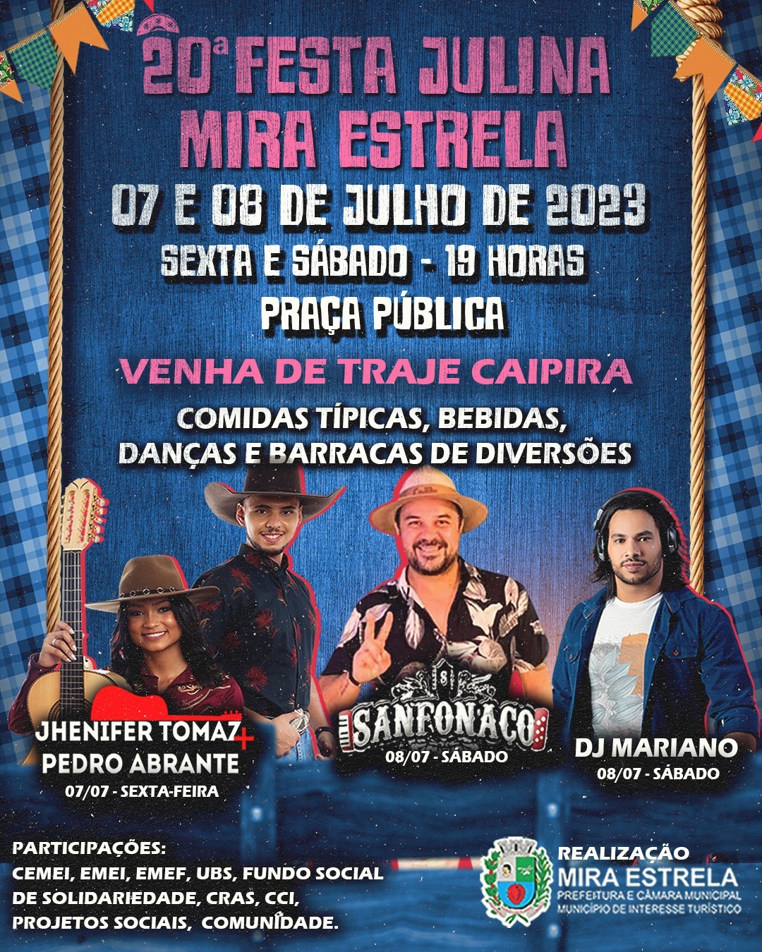 Nos dias 7 e 8 de julho, o município de Mira Estrela realizará a tradicional 20ª Festa Julina na praça pública a partir das 19 horas.
